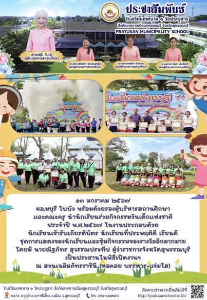 วันที่ 13 มกราคม 2567 นางมยุรี ใบบัว ผู้อำนวยการสถานศึกษา รองผู้อำนวยการสถานศึกษา คณะครู นำนักเรียนเข้าร่วมงานวันเด็กแห่งชาติ ประจำปี พ.ศ. 2567 โดยนายณัฐภัทร สุวรรณประทีป ผู้ว่าราชการจังหวัดสุพรรณบุรี เป็นประธานในงานดังกล่าว ภายในงานมีกิจกรรมนันทนาการ เล่นเกม การแสดงของนักเรียน แจกอาหาร เครื่องดื่ม กระเป๋าของขวัญ และของรางวัลมากมาย ทั้งนี้มีนักเรียนได้รับเกียรติบัตรนักเรียนเรียนดี ประพฤติดีด้วย ณ สวนเฉลิมภัทรราชินี (หอคอยบรรหาร-แจ่มใส) |