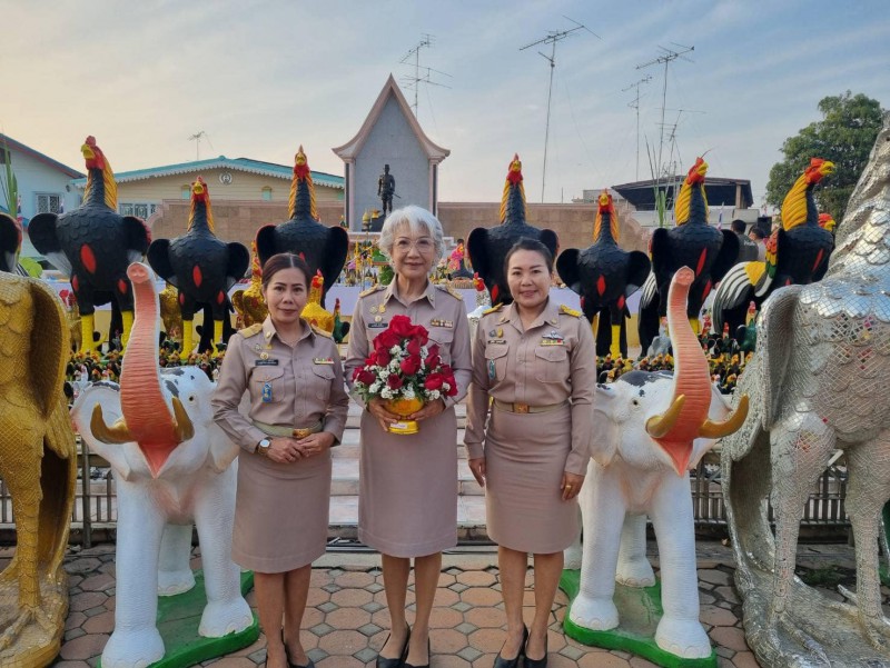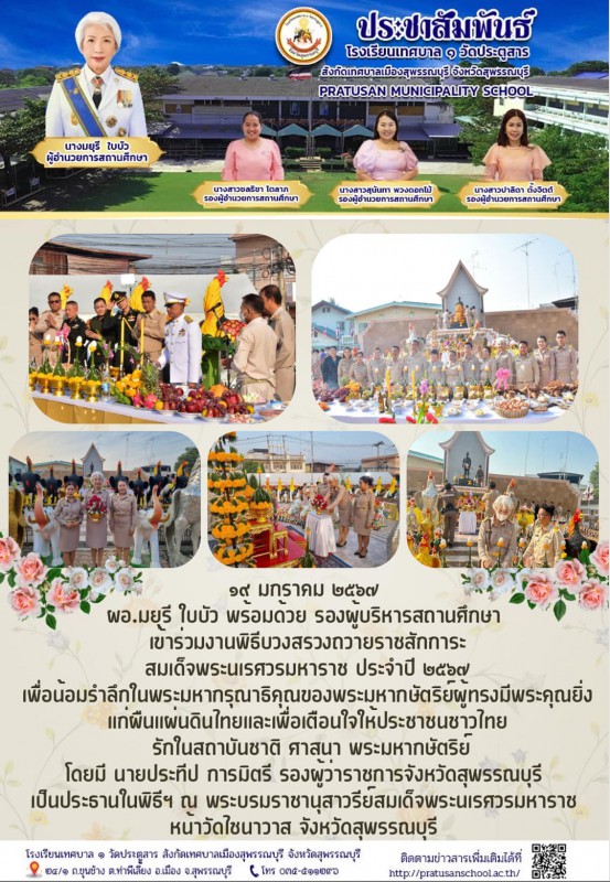 วันที่ 19 มกราคม 2567 นางมยุรี ใบบัว ผู้อำนวยการสถานศึกษา นางสาวสุนันทา พวงดอกไม้ รองผู้อำนวยการสถานศึกษา นางสาวปาลิดา ตั้งจิตต์ รองผู้อำนวยการสถานศึกษา ร่วมพิธีบวงสรวงถวายราชสักการะสมเด็จพระนเรศวรมหาราช เพื่อน้อมรำลึกในพระมหากรุณาธิคุณของพระมหากษัตริย์ผู้ทรงมีพระคุณยิ่งแก่ผืนแผ่นดินไทย และเพื่อเตือนใจให้ประชาชนชาวไทยรักในสถาบันชาติ ศาสนา พระมหากษัตริย์ โดยมีนายประทีป การมิตรี รองผู้ว่าราชการจังหวัดสุพรรณบุรี เป็นประธานในพิธีฯ ณ พระบรมราชานุสาวรีย์สมเด็จพระนเรศวรมหาราช (หน้าวัดไชนาวาส) |