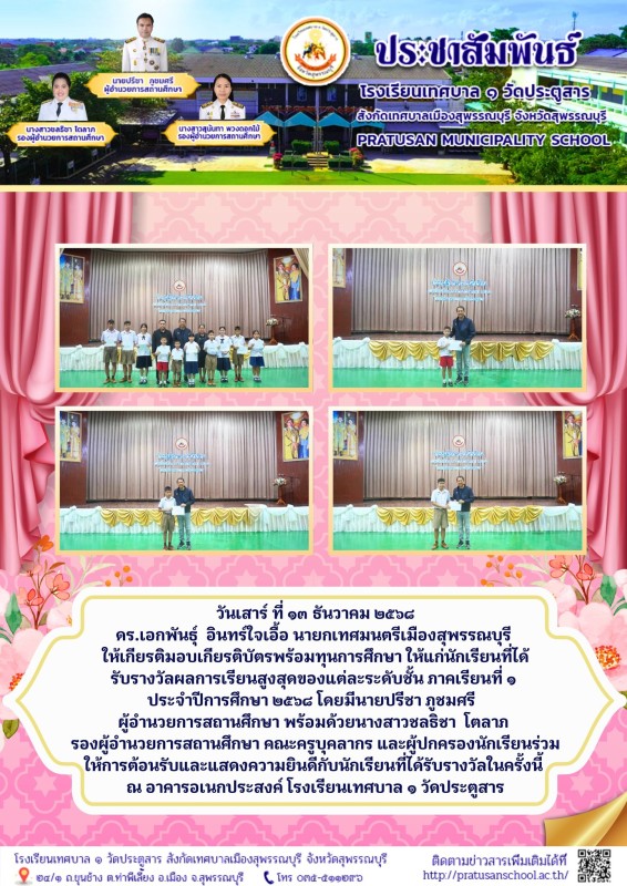 นายกเทศมนตรีเมืองสุพรรณบุรีมอบเกียรติบัตรและทุนการศึกษาแก่นักเรียน